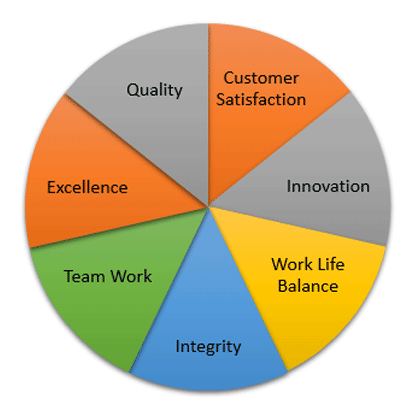 Customer Satisfaction, Excellence, Innovation, Integrity, Quality, Teamwork, and Work life balance